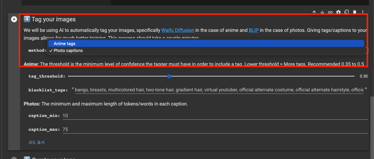 이미지에 태그를 자동 생성합니다. 실사 사진은 “Photo captions”, 애니메이션이나 일러스트는 “Anime tags”를 선택하세요.