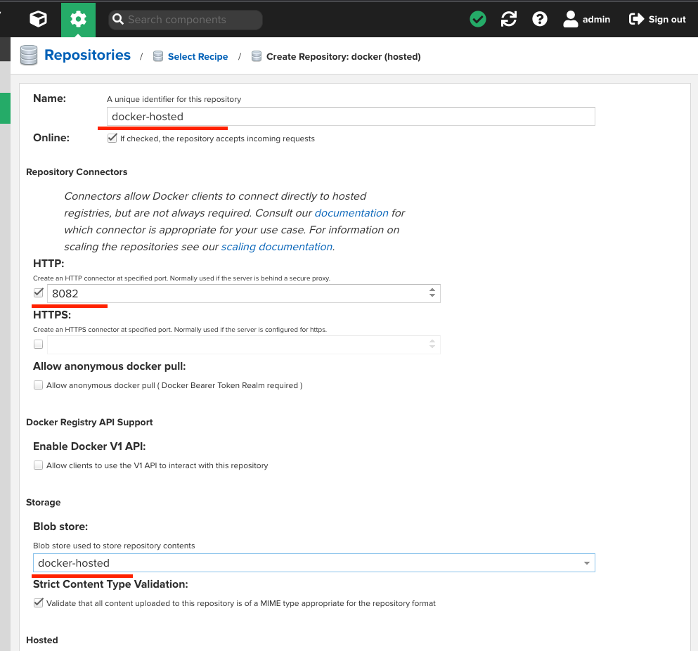 docker(hosted)를 선택하고 HTTP 포트는 8082를 설정합니다.