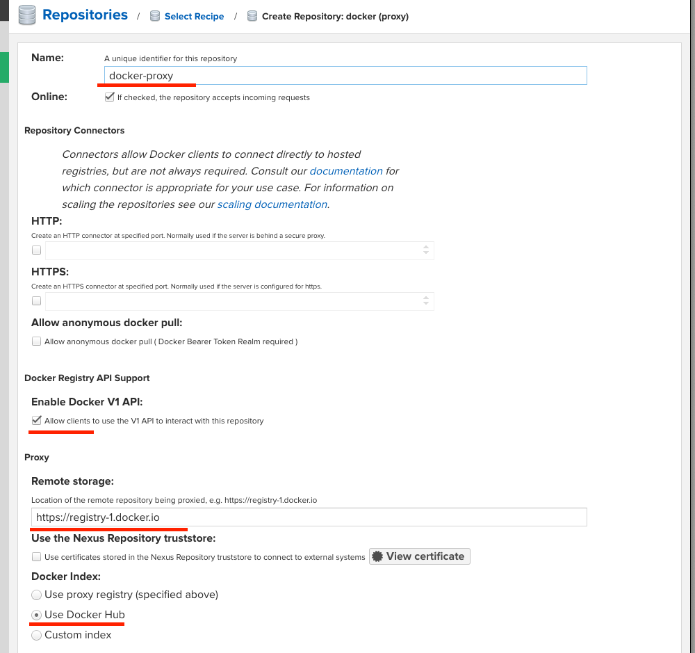docker(proxy)를 생성할 때 Remote storage는 Docker Hub의 URL입니다: https://registry-1.docker.io