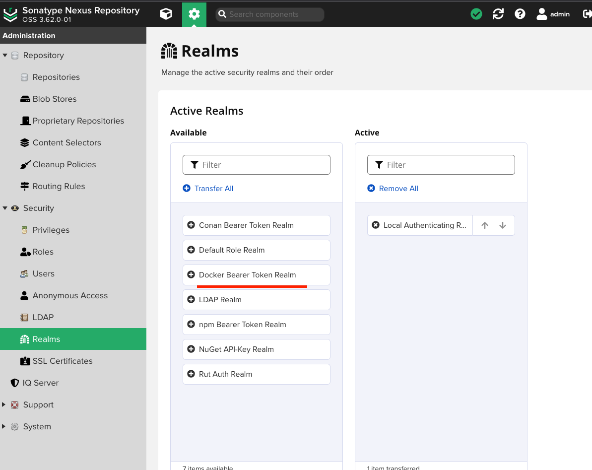 Docker Bearer Token Realm을 활성화하여 Docker 클라이언트가 Nexus와 통신할 수 있도록 해요.