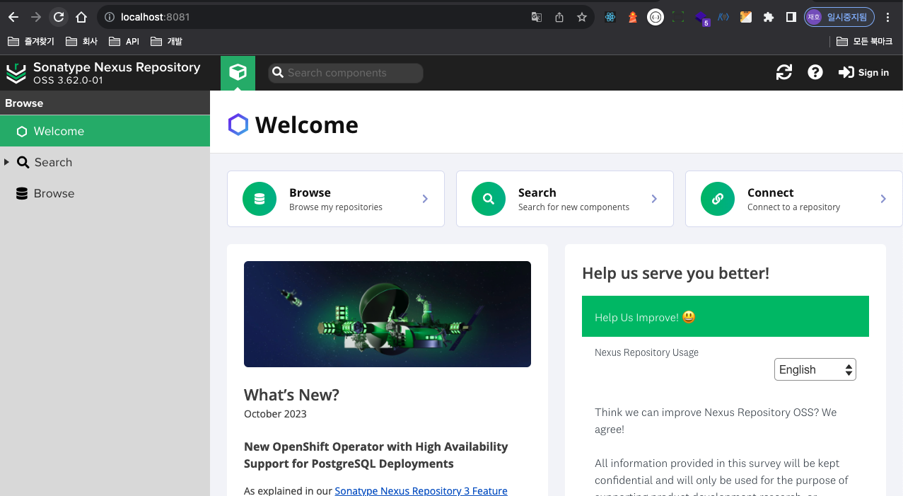 초기 비밀번호는 volume 폴더에서 확인하거나 컨테이너 내부의 /nexus-data/admin.password에서 확인할 수 있습니다.